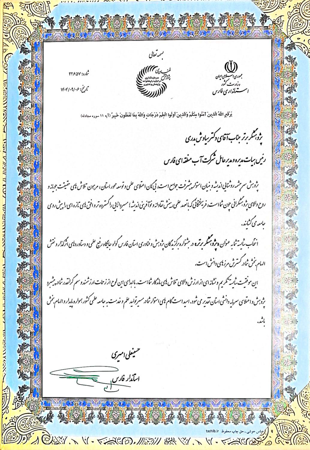 در لوح اعطایی حسینعلی امیری، استانداری فارس خطاب به سیاوش بدری رئیس هیئت مدیره و مدیرعامل شرکت آب منطقهای، آمده است.